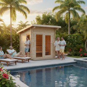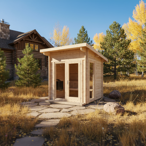This authentic Scandinavian sauna features a premium-quality spruce exterior to keep you protected from the elements and ensure a lifetime of enjoyment. The weatherproof sloped roof manages rainwater efficiently to keep your sauna warm and dry. Its lockable framed tempered glass door closes confidently and securely, using professional-grade hinges and corrosion-proof aluminum handle.