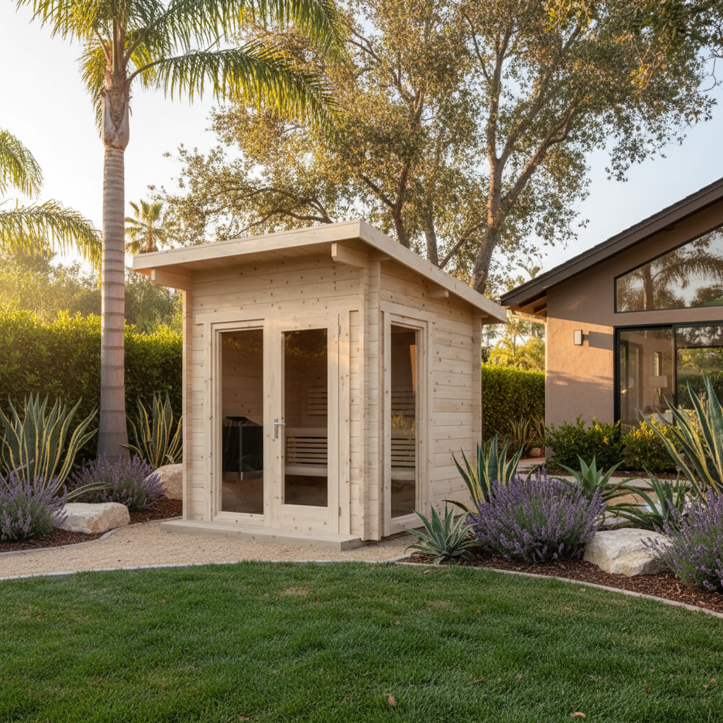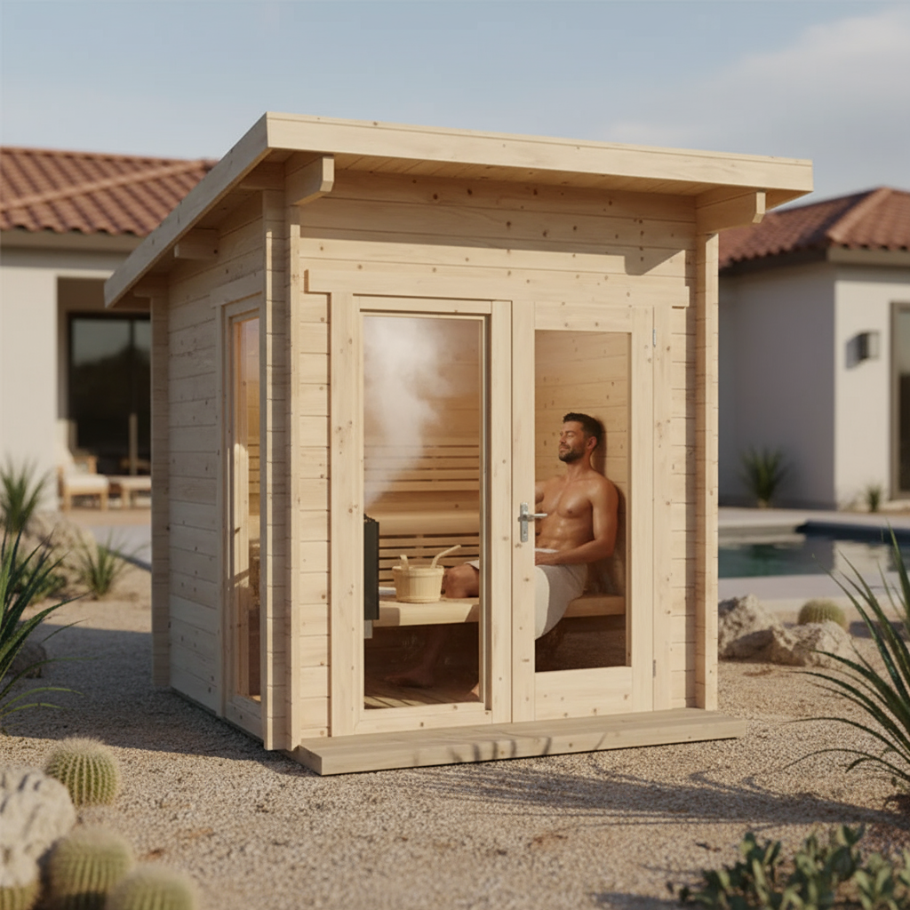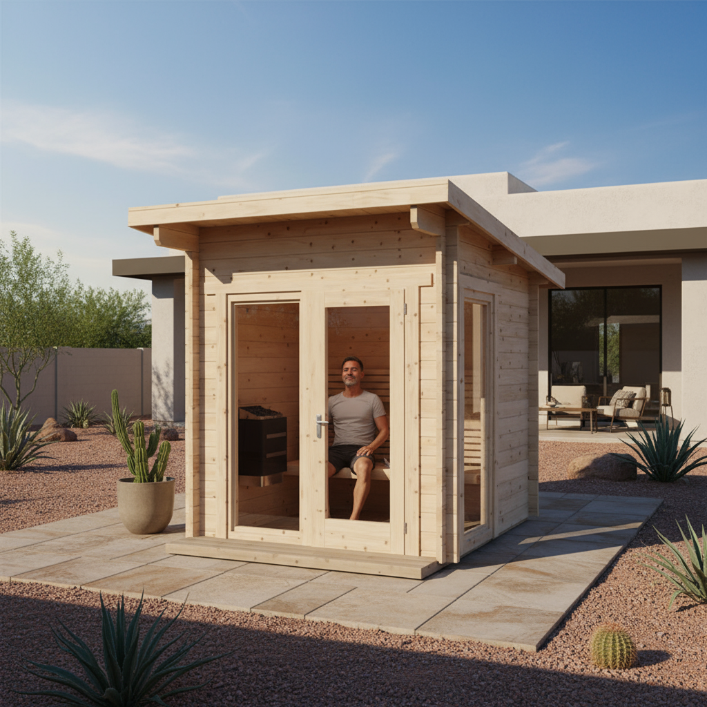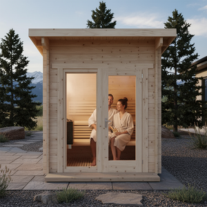 The 6-person Model G4 outdoor home sauna provides a spacious backyard wellness escape big enough for friends and family. Smooth, two-tier I-shaped satin-finish aspen benches allow bathers to sit higher in the room for a more intense sauna experience. Natural light emanates from the full-glass front and large side window, accentuating the spaciousness of this sauna and highlighting the natural beauty of the wood.