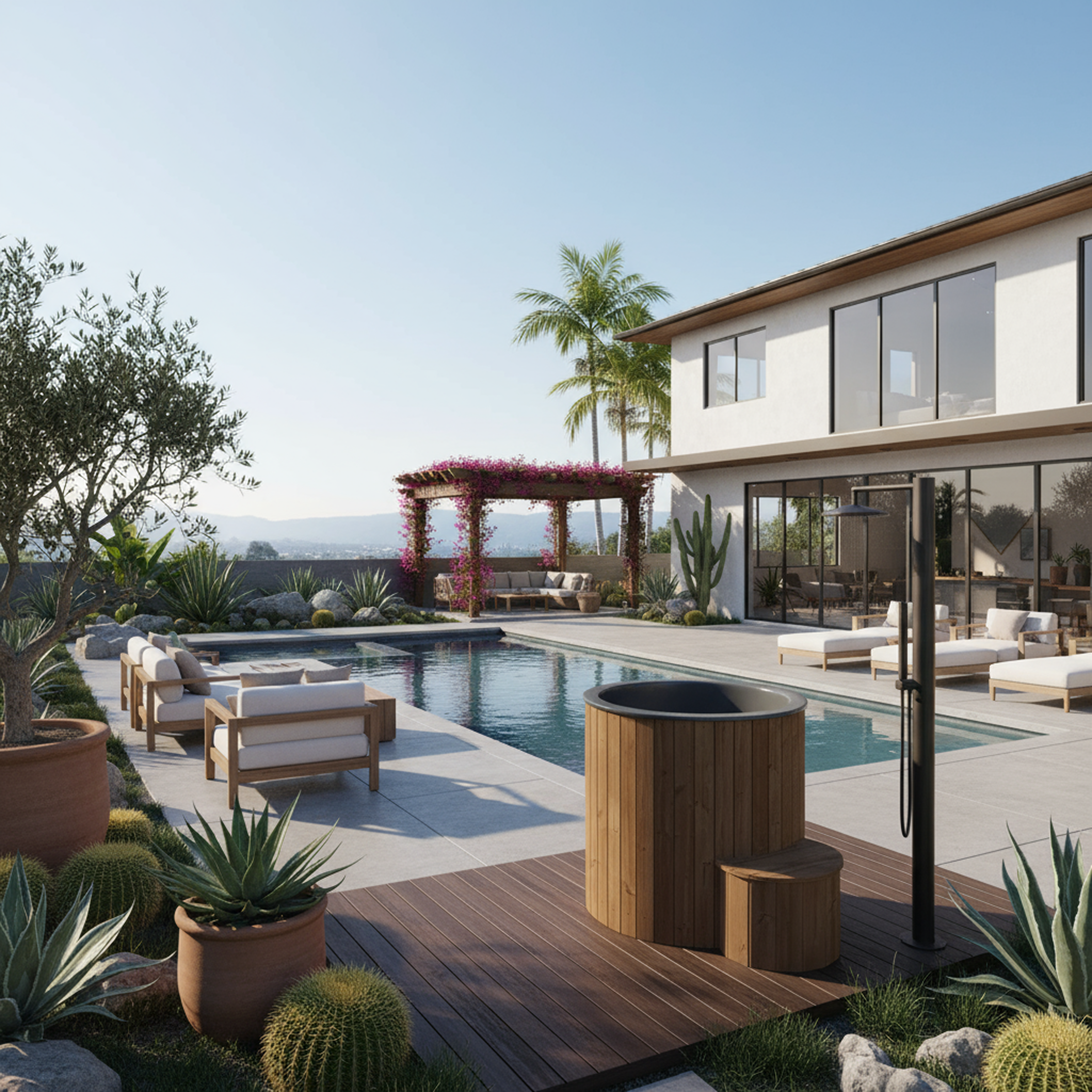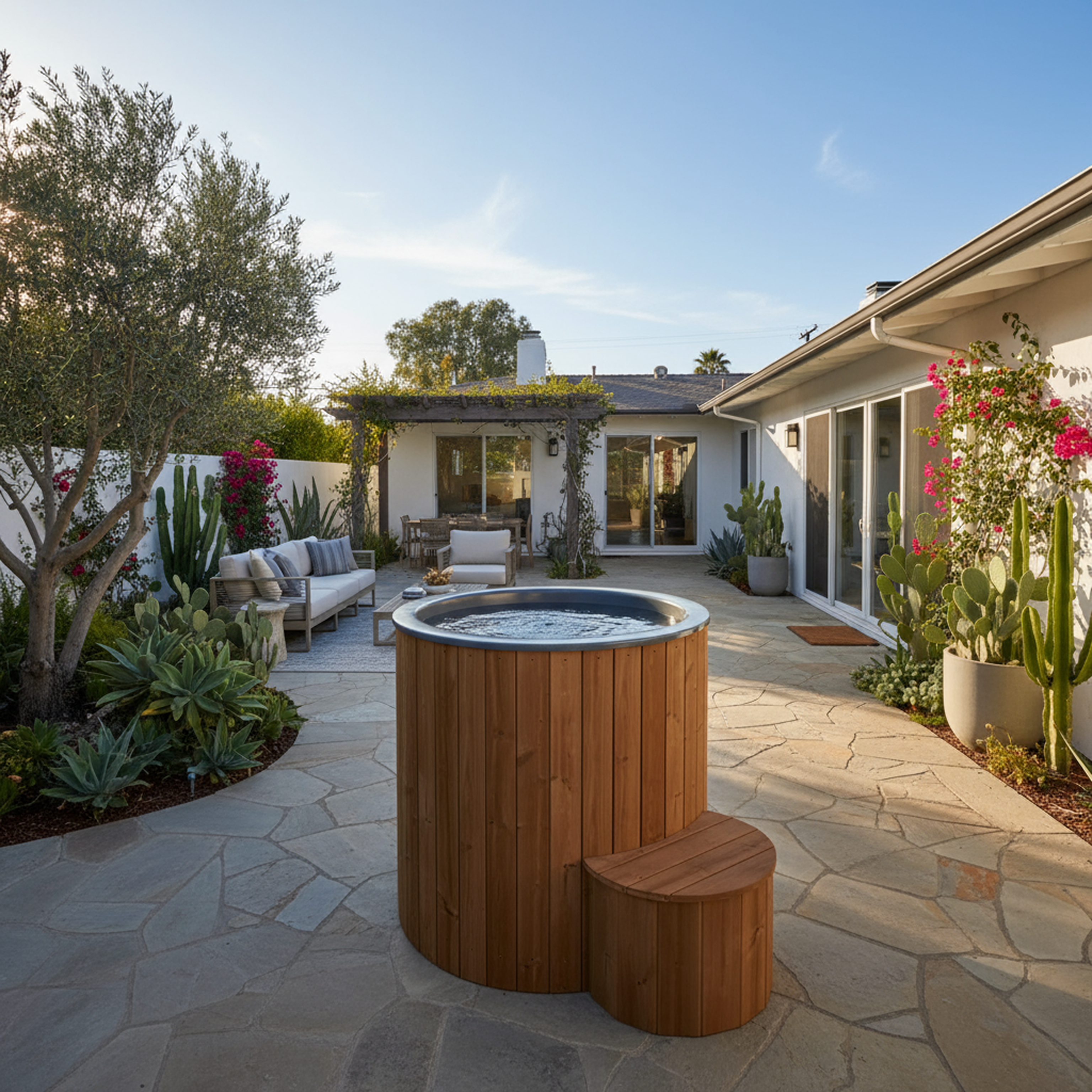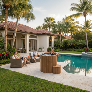 Pre-assembled for easy installation, the natural-colored enhanced Thermo-Pine wood exterior will last up to 2X longer than cedar and has superior thermal resistance. The spacious fiberglass tub contoured for the shape of your body has a 124-gallon water capacity to allow you to submerge in comfort. Matching Thermo-Pine stairs make it wasy to get in and out of the tub.
