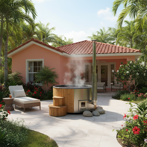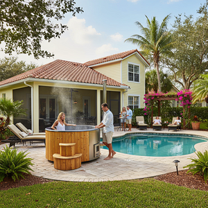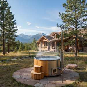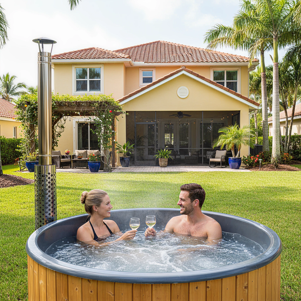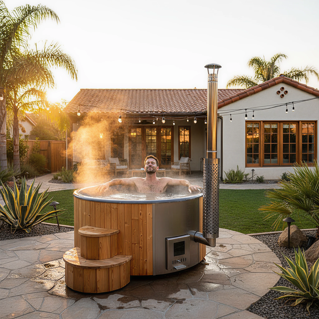 Relax with friends and family the luxury of your Model S4 backyard wood-burning hot tub from SaunaLife.